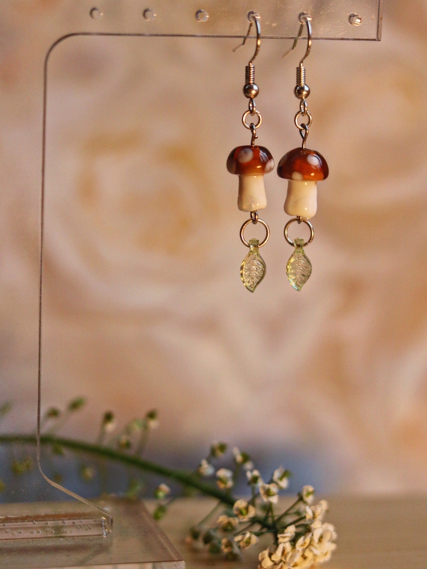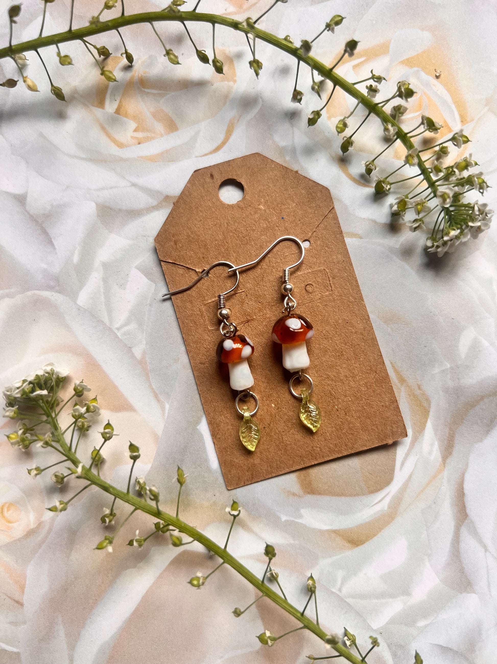 These earrings feature dangly glass mushrooms and green dainty leaves, perfect for those enchanted by fairycore and cottagecore aesthetics. With a forest vibe and a touch of hobbit charm, these earrings add a whimsical touch to any outfit.