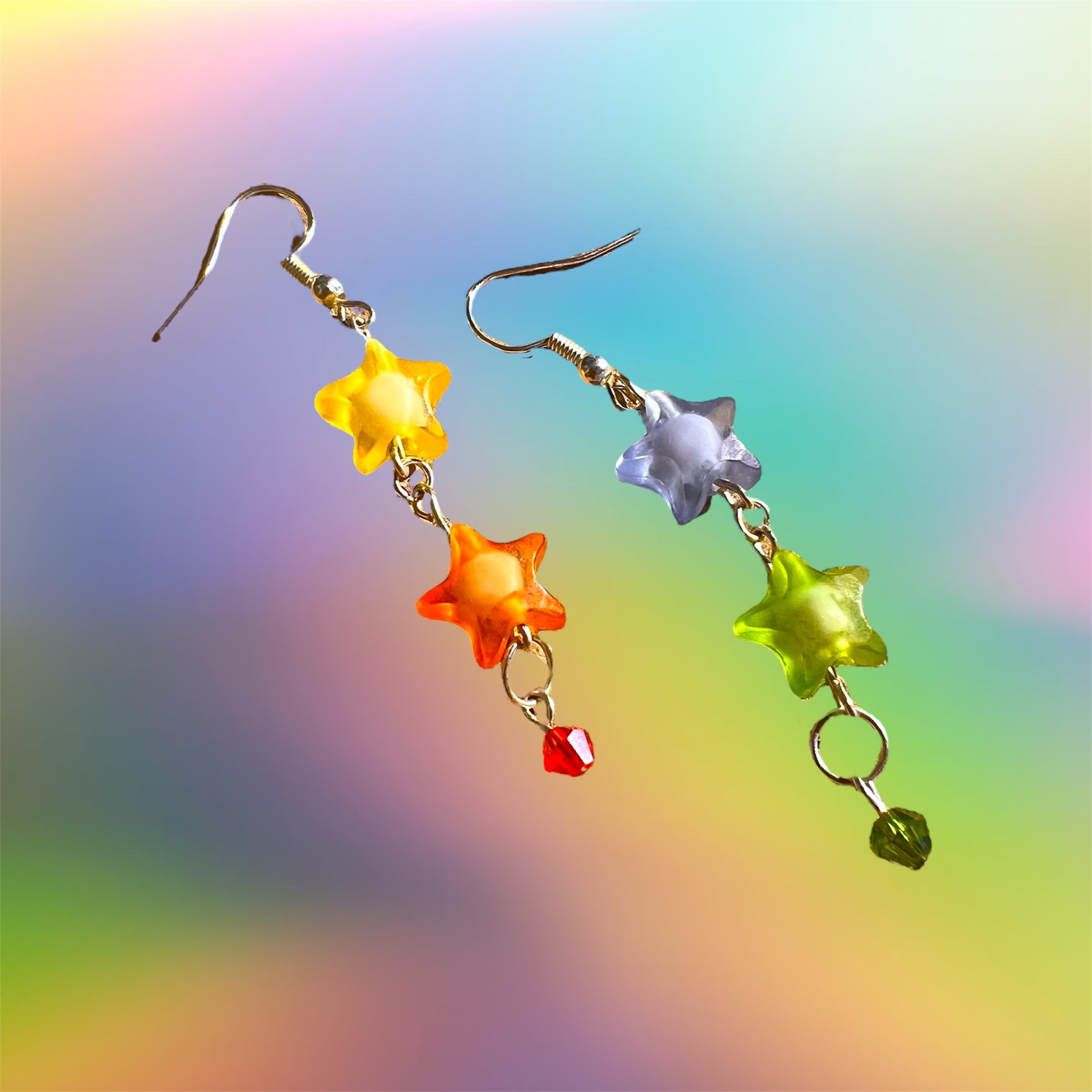 Add some playful color to your outfit with our Rainbow Earrings! Made with acrylic star beads and colorful gems, these earrings are a fun and quirky addition to your accessory collection. Perfect for those who love to stand out and embrace their unique style.